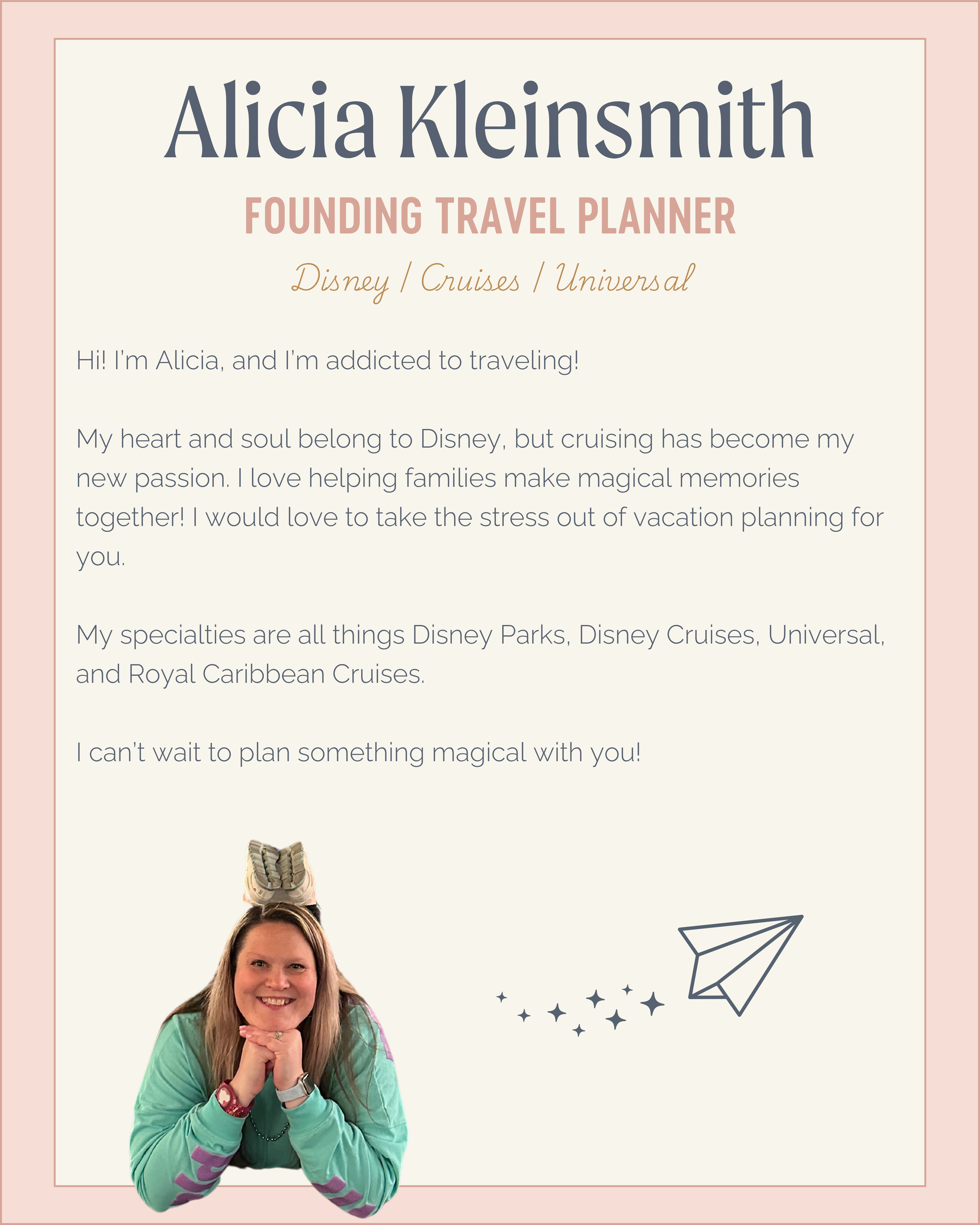 A travel planner introduction page for Alicia Kleinsmith featuring her photo smiling, with a paper airplane icon and stars.