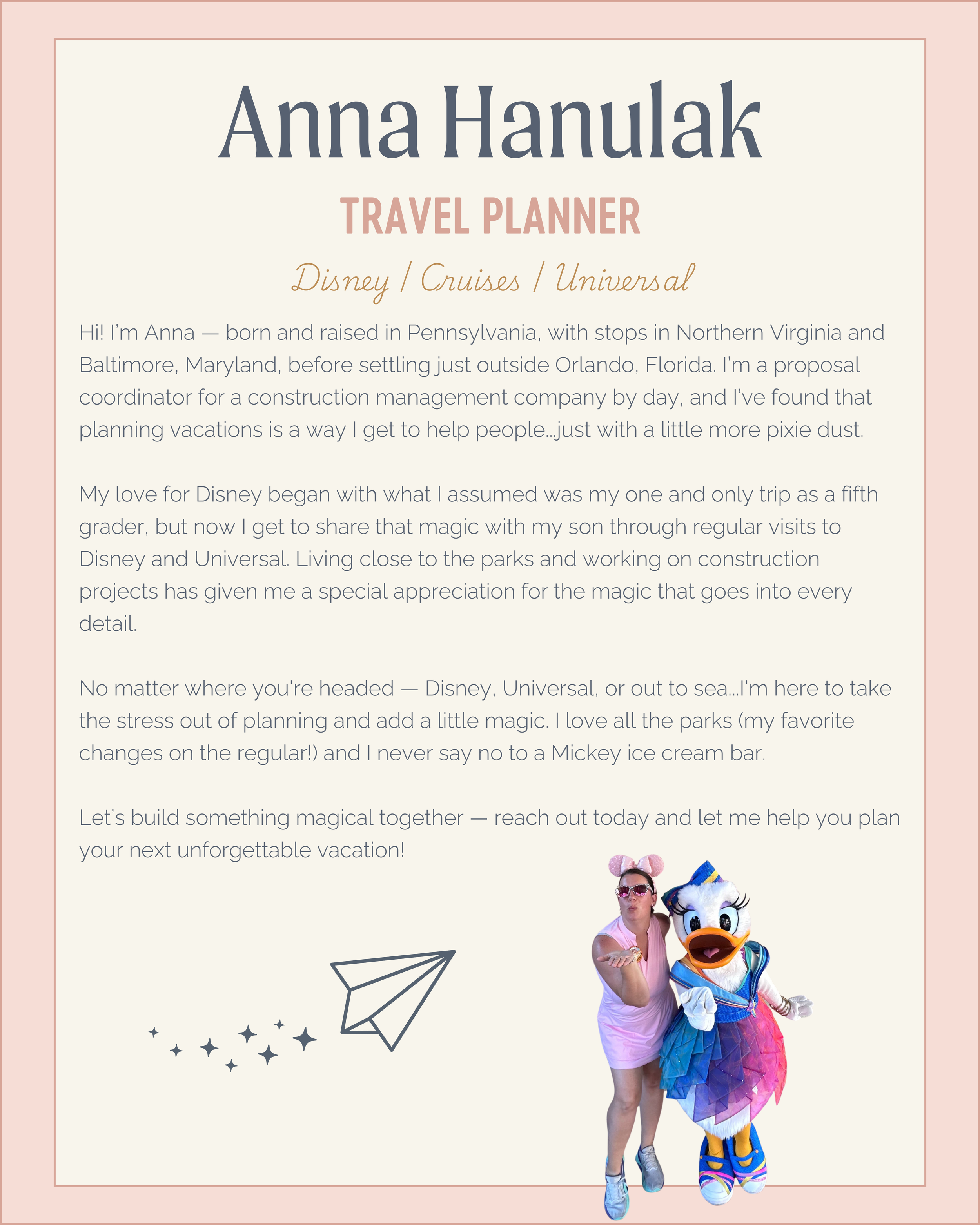 A travel planner for Disney and Universal vacations featuring a woman in pink dress and Minnie Mouse mascot posing together, with a paper airplane icon on a pink and beige background.