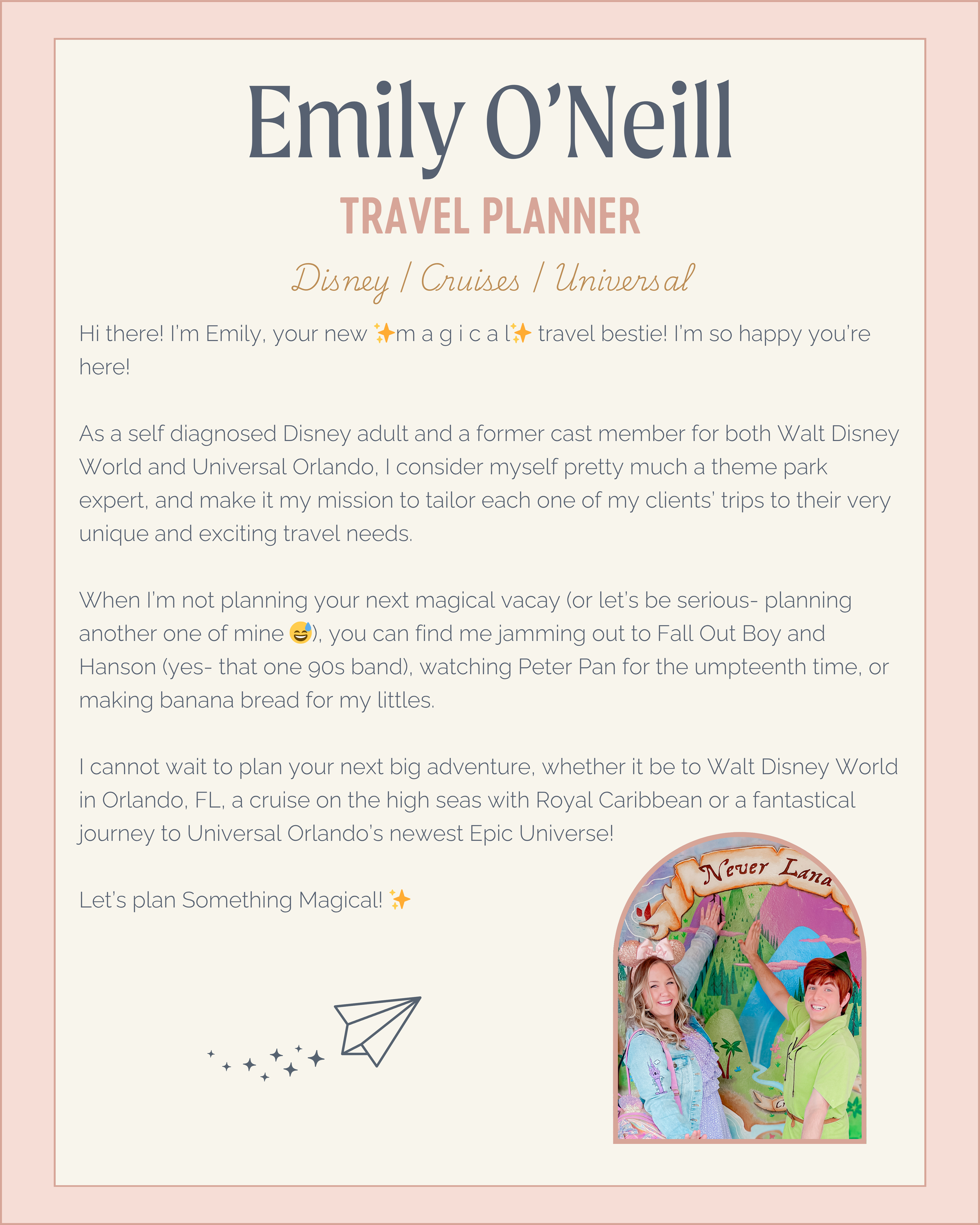 Travel planner cover page for Emily O'Neill with a photo of two people; a woman with blonde hair and a man with red hair, smiling and pointing at a sign that says "Never Land," with a colorful background of mountains, trees, and a river.