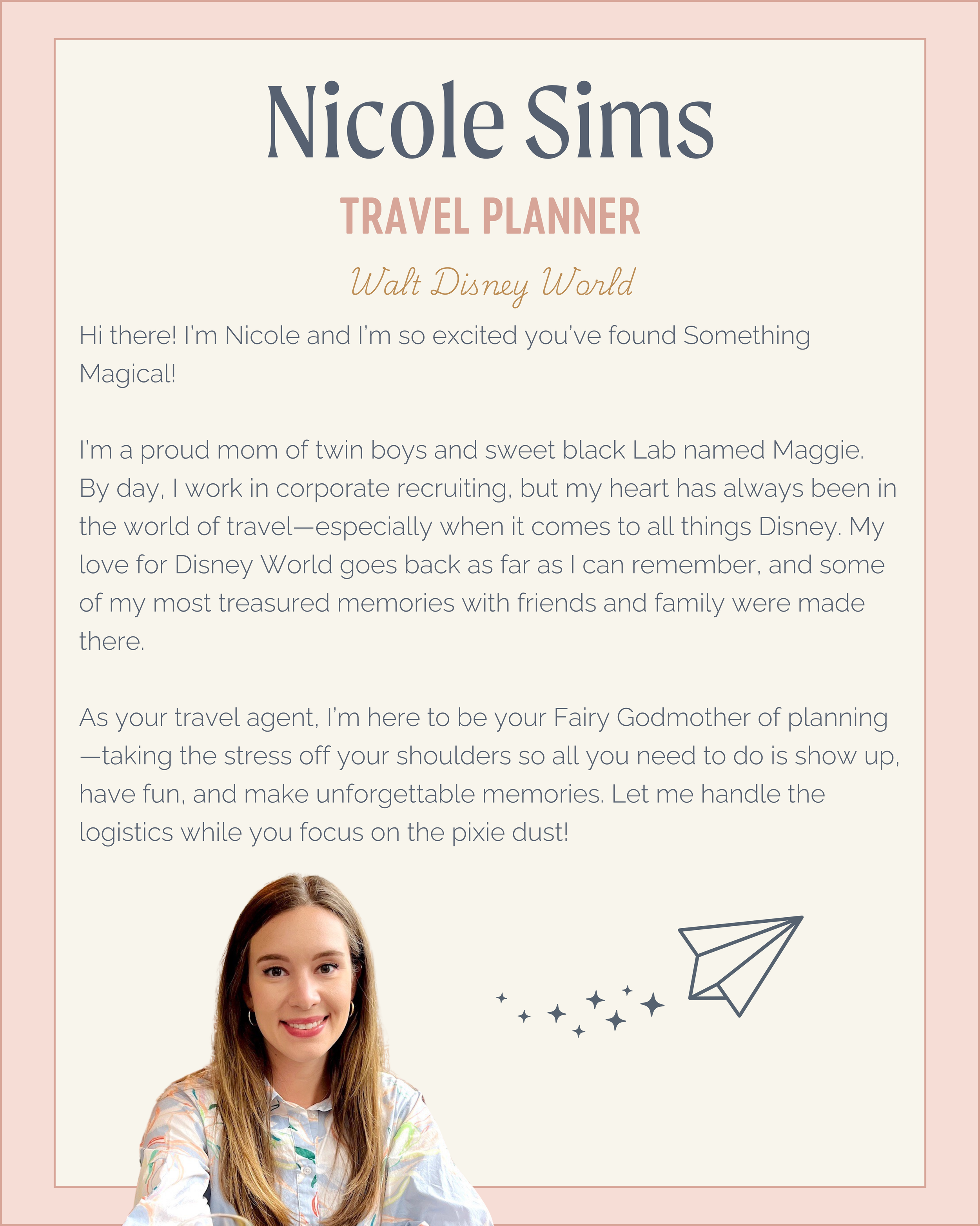 A travel planner cover page for Nicole Sims featuring her photo, a paper airplane icon, and personalized introductory text about her love for Disney and travel planning.