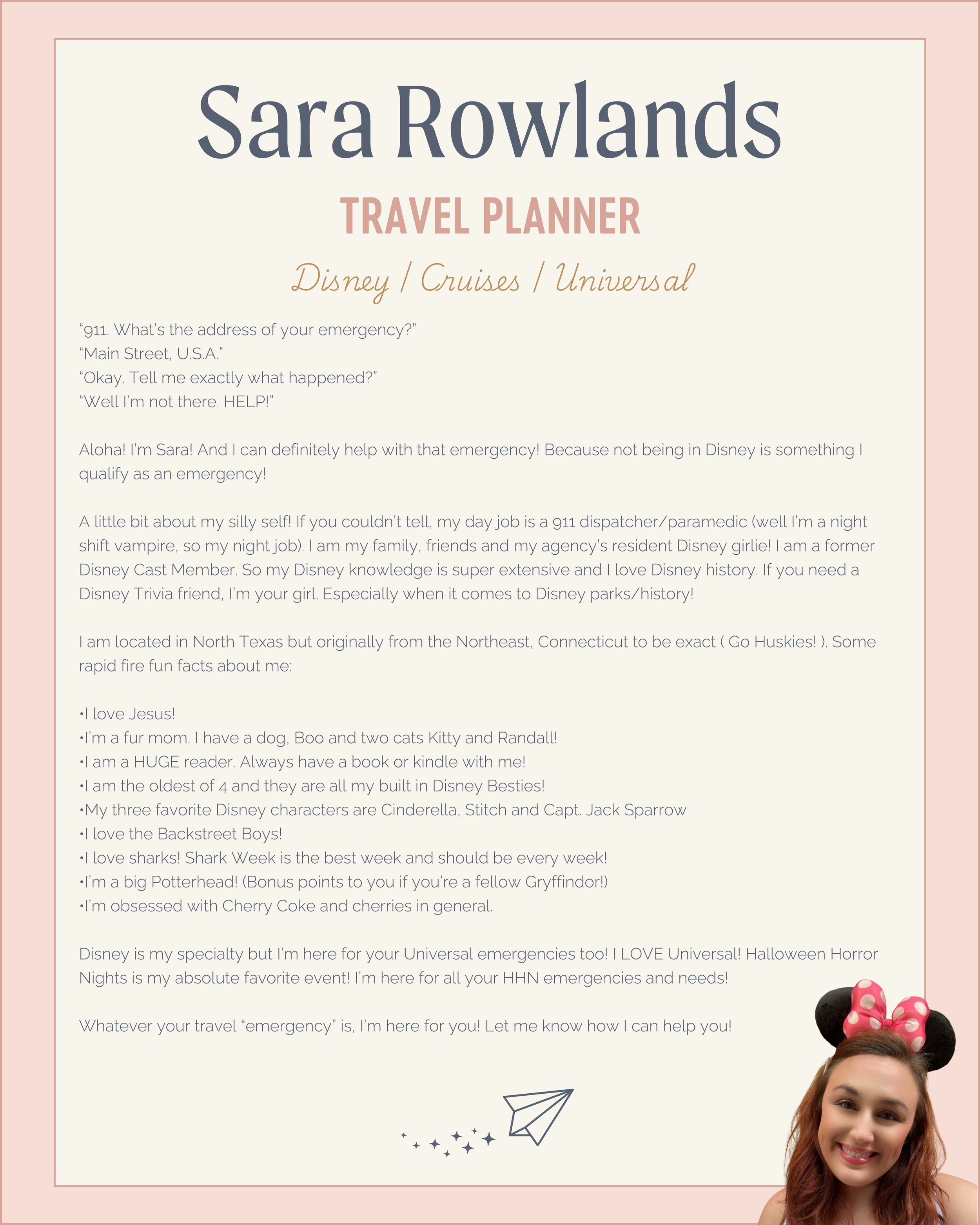 A travel planner document for Sara Rowlands, a Disney enthusiast from North Texas, with her photo in the bottom right corner featuring a woman wearing Minnie Mouse ears with a pink polka dot bow. The document includes her personal interests, fun facts, and emergency contact details, decorated with small icons of a paper airplane and stars.